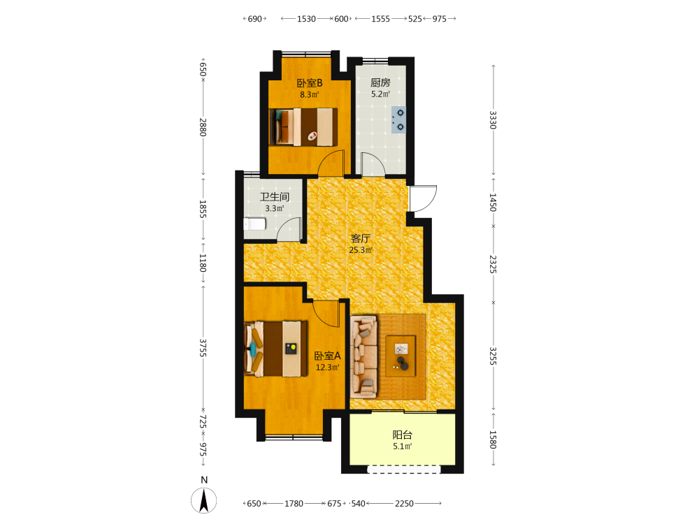 2室2厅1卫1厨1阳
