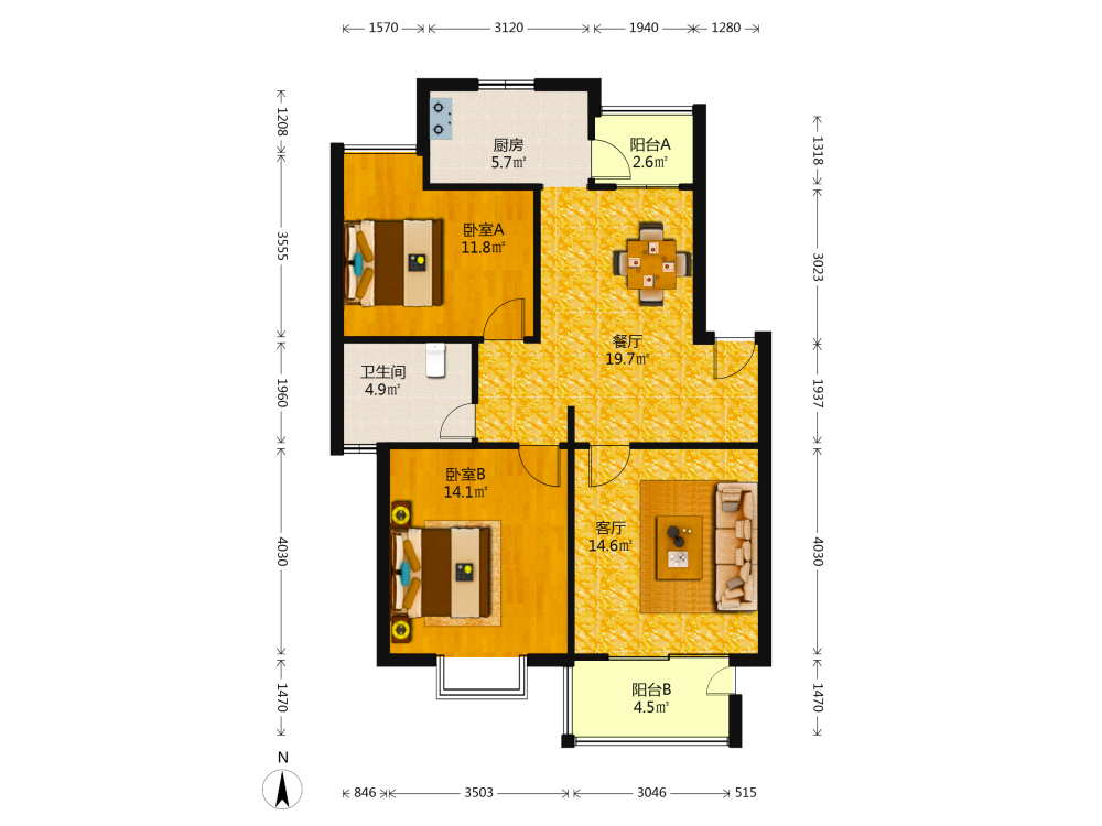 2室2厅1卫1厨1阳