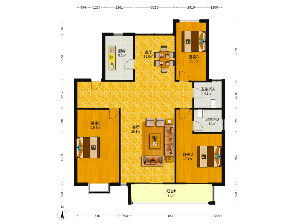3室2厅1卫1厨1阳
