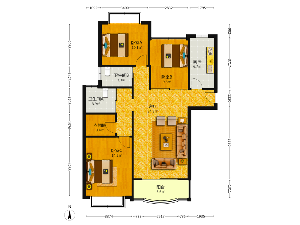 3室2厅1卫1厨1阳