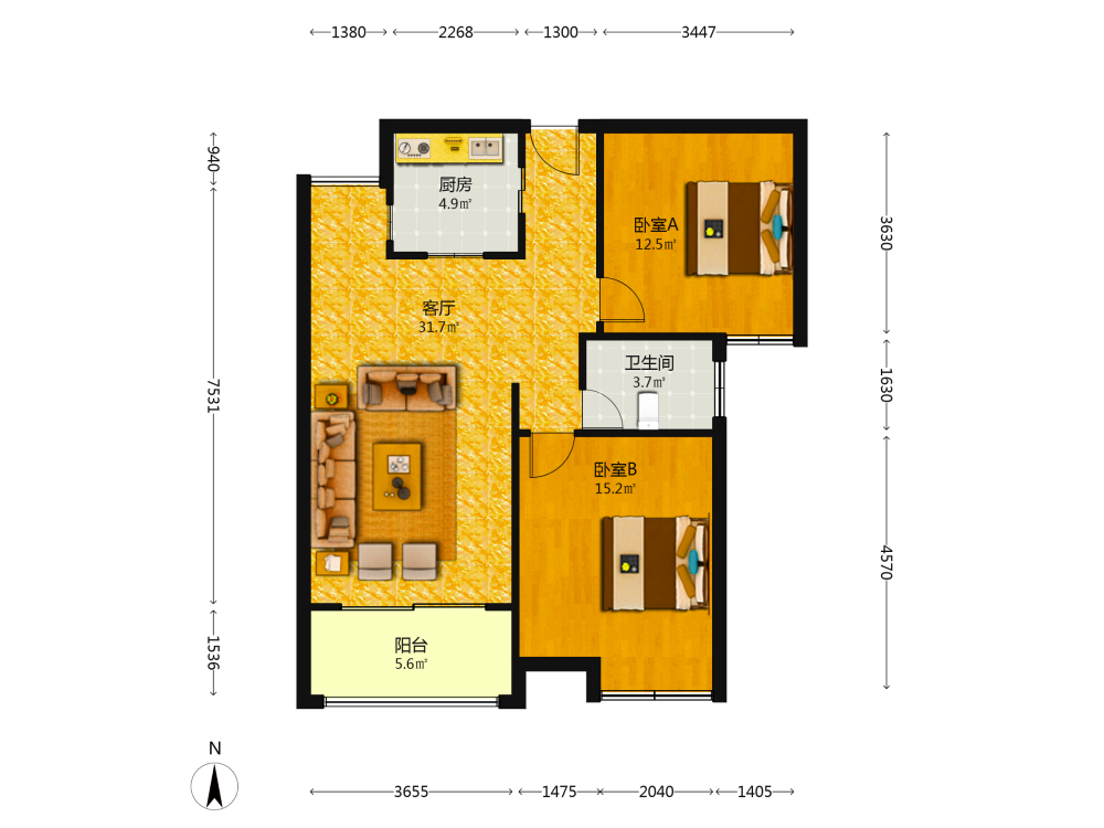 2室2厅1卫1厨1阳