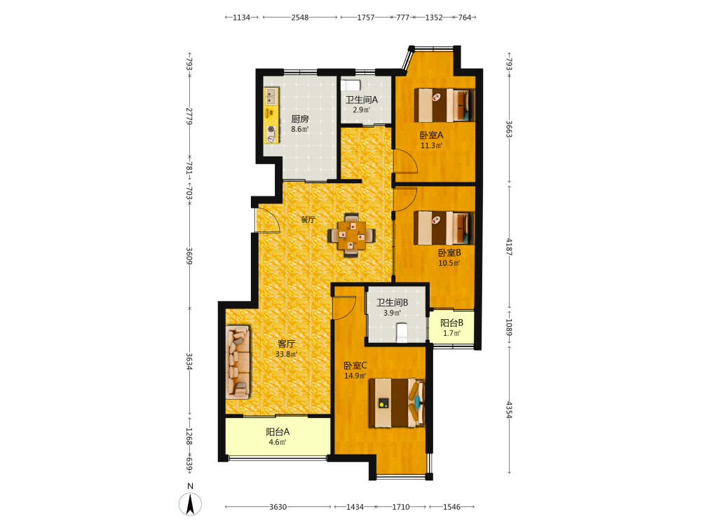 3室2厅1卫1厨1阳