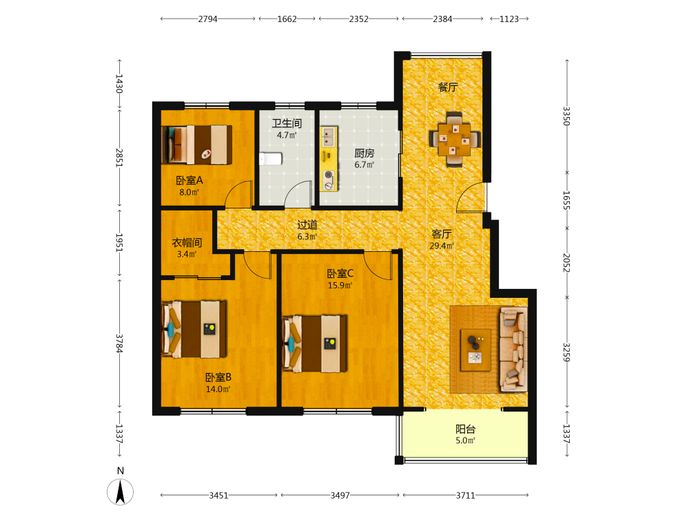 3室2厅1卫1厨1阳