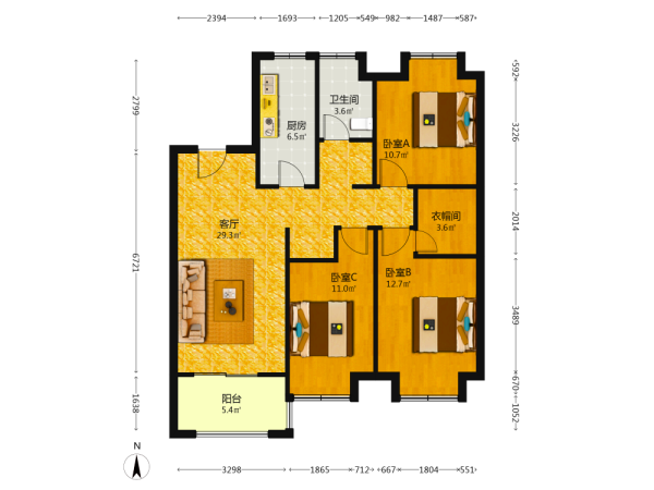 3室2厅1卫1厨1阳