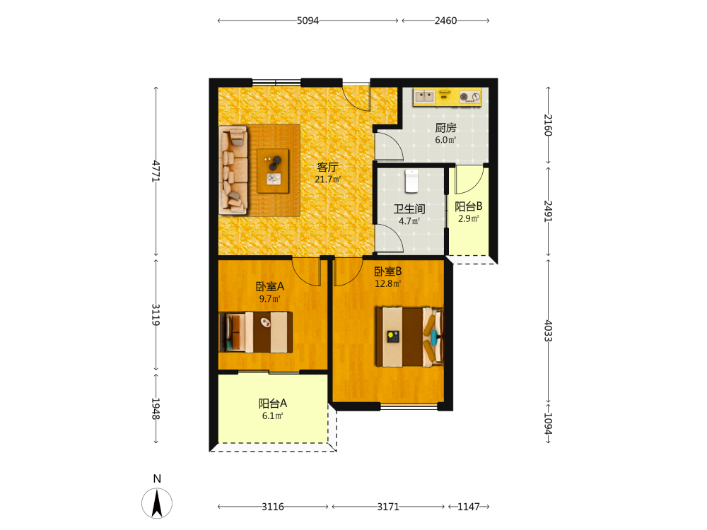 2室2厅1卫1厨1阳